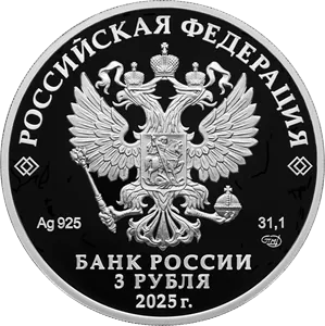 На аверсе представлен объемный герб России, над которым по краю монеты изогнута надпись: «РОССИЙСКАЯ ФЕДЕРАЦИЯ», окаймленная по бокам парами ромбов. Под гербом слева находятся маркировка благородного металла и его проба, Аверс-рельефное изображение Государственного герба Российской Федерации, над ним вдоль канта – надпись полукругом «РОССИЙСКАЯ ФЕДЕРАЦИЯ», обрамленная с обеих сторон сдвоенными ромбами, под гербом слева – обозначения драгоценного металла и пробы сплава, справа – содержание химически чистого металла и товарный знак монетного двора, внизу в центре в три строки – надпись «БАНК РОССИИ», номинал монеты «3 РУБЛЯ», год выпуска «2025 г.».