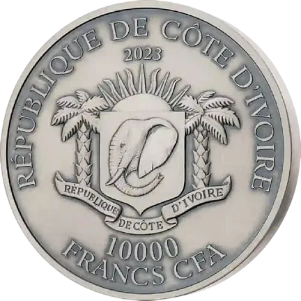 На аверсе изображен герб Берега Слоновой Кости и надписи: «REPUBLIQUE DE COTE D'IVOIRE» — страна-эмитент, «2023» — год выпуска и «5000 FRANCS CFA» — номинал.
