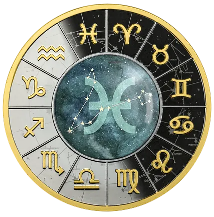 На реверсе монеты изображен символ и созвездие Рыбы под увеличительным стеклом. Вокруг 12 символов знаков Зодиака и их созвездий.