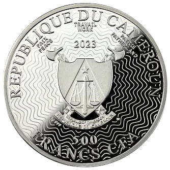 На аверсе монеты изображен герб Камеруна и надписи: «REPUBLIQUE DU CAMEROUN» — страна выпуска, «2023» — год выпуска и «500 FRANCS CFA» — номинал.