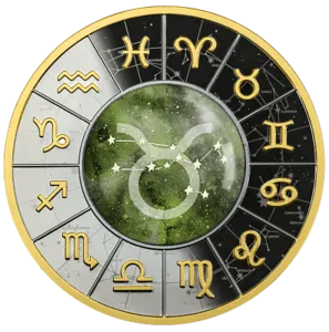 На реверсе монеты изображен символ и созвездие Тельца под увеличительным стеклом. Вокруг 12 символов знаков Зодиака и их созвездий.
