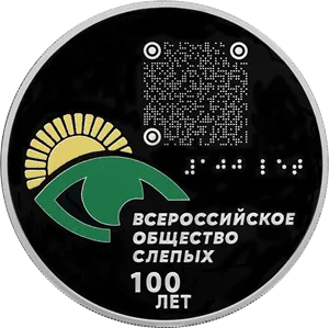 Реверс: выполненный в цвете и рельефе логотип Всероссийского общества слепых (ВОС), над ним – выполненный в технологии лазерного матирования QR-код, который при наведении камеры смартфона переводит пользователя на официальный сайт ВОС с возможностью тифлокомментирования, позволяющего получить информацию о монете путем слухового восприятия, и рельефная надпись «100 лет», выполненная шрифтом Брайля; внизу – рельефная надпись в две строки «100 ЛЕТ».