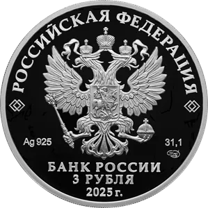 Аверс: рельефное изображение Государственного герба Российской Федерации, над ним вдоль канта – надпись полукругом «РОССИЙСКАЯ ФЕДЕРАЦИЯ», обрамленная с обеих сторон сдвоенными ромбами, под гербом слева – обозначения драгоценного металла и пробы сплава, справа – содержание химически чистого металла и товарный знак монетного двора, внизу в центре в три строки – надпись «БАНК РОССИИ», номинал монеты «3 РУБЛЯ», год выпуска «2025 г.».