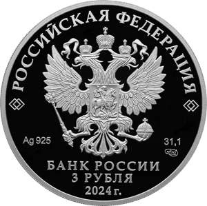 Аверс: рельефное изображение Государственного герба Российской Федерации, над ним вдоль канта – надпись полукругом «РОССИЙСКАЯ ФЕДЕРАЦИЯ», обрамленная с обеих сторон сдвоенными ромбами, под гербом слева – обозначения драгоценного металла и пробы сплава, справа – содержание химически чистого металла и товарный знак монетного двора, внизу в центре в три строки – надпись «БАНК РОССИИ», номинал монеты «3 РУБЛЯ», год выпуска «2024 г.».