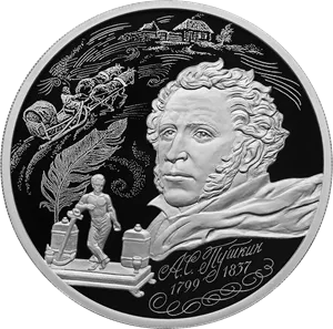 Реверс: рельефные изображения портрета А.С. Пушкина и чернильницы, а также выполненные в технике лазерного матирования изображения сцены зимней поездки и пера; под портретом – надпись «А.С. Пушкин», годы жизни поэта «1799» и «1837» и декоративный орнамент.