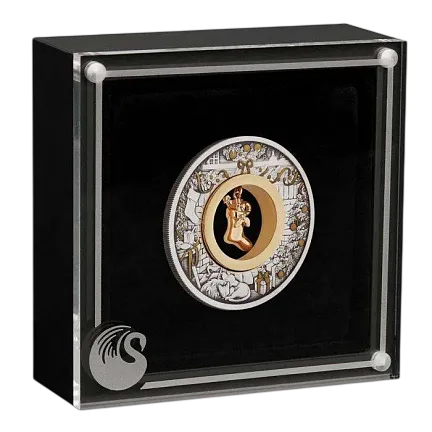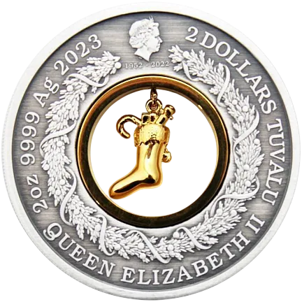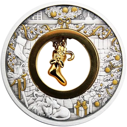 На реверсе монеты, излучающей тепло и праздничную радость, изображен традиционный очаг в канун Рождества. Дизайн с елкой, венком и гирляндами, украшенными цветными шарами и лентами, включает в себя чулок, снежные шары, коробки в подарочной упаковке, сонных домашних животных и прохладительные напитки для Санты в его самую загруженную ночь в году. В дизайн также включен знак монетного двора Пертского монетного двора «P». В центре монеты заключен рождественский чулок, покрытый 24-каратным золотом.