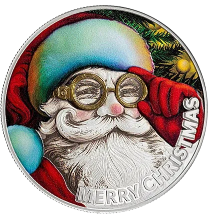 На реверсе монеты изображен Санта-Клаус с тёплой улыбкой, поправляющий свои круглые очки. Его праздничная красная шапка и перчатки, вместе с надписью "MERRY CHRISTMAS" справа, идеально передают рождественский дух. На заднем плане видна рождественская ёлка и украшения, которые добавляют сезонное настроение.