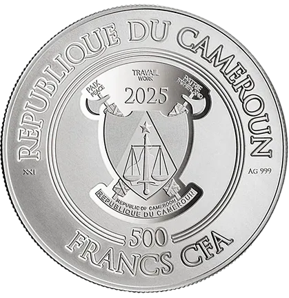 Аверс монеты содержит изображение герба Камеруна и надписи: "REPUBLIQUE DU CAMEROUN" – страна-эмитент, "2025" – год выпуска и "500 FRANCS CFA" – номинал монеты.