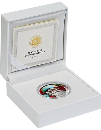 Эта прекрасная монета из серебра весом 1/2 унции посвящена празднованию Рождества с классическим изображением Санта-Клауса. Монета отличается сложной цветной отделкой и поставляется в футляре с сертификатом подлинности. Тираж ограничен 500 экземплярами по всему миру.